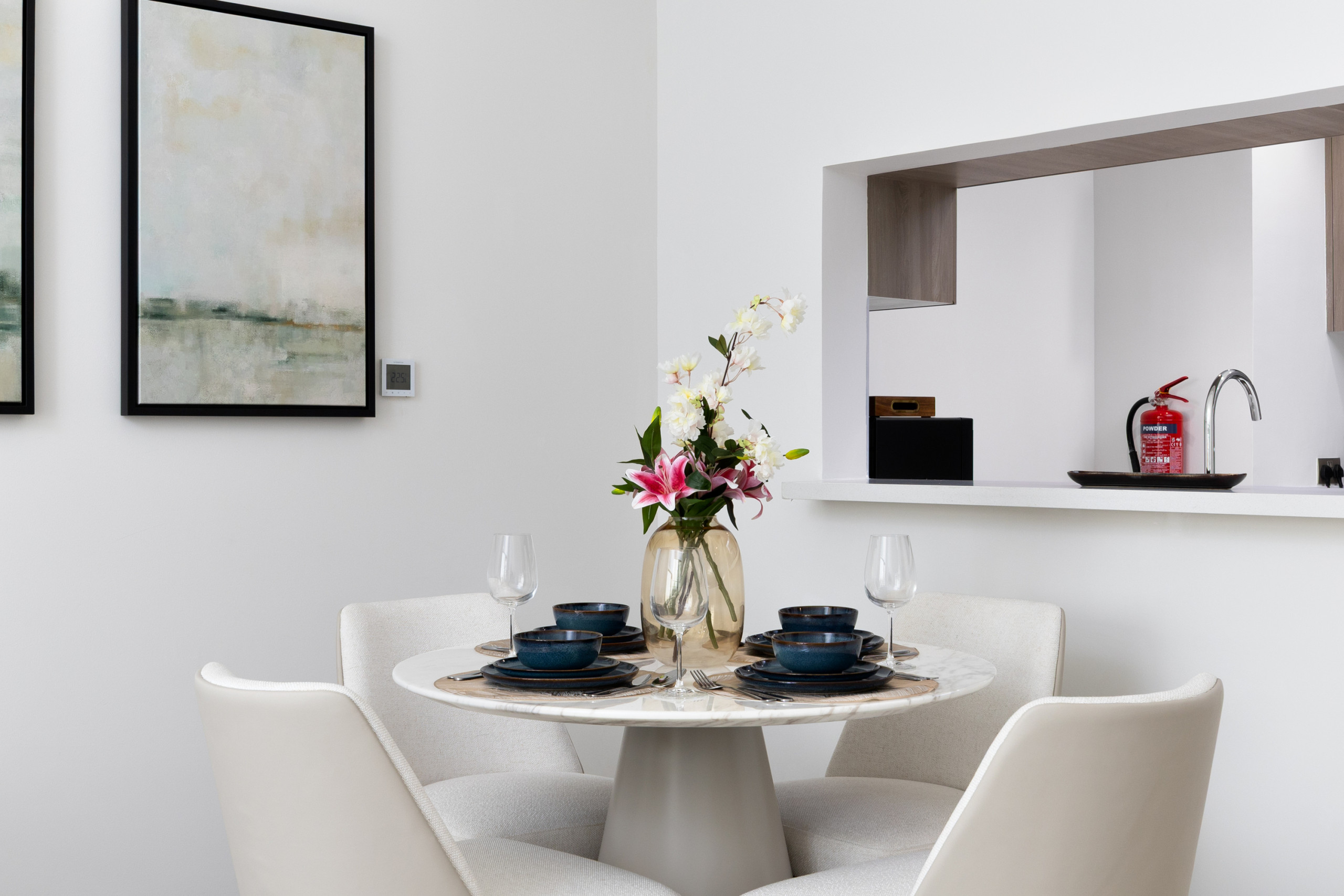 Step into a bright, open-plan living space that combines comfort and simplicity with effortless style. The lounge area features a soft, inviting sofa and a cozy armchair perfect for relaxing with a book or watching your favourite series on the wall-mounted flat-screen TV. Neutral tones and uncluttered design give the space a calm, airy feel, while sliding doors open onto a private balcony where you can enjoy tranquil canal views and gentle evening breezes. The dining area seats four and doubles as a casual workspace, while the modern kitchen is fully equipped with essential appliances and sleek cabinetry, ideal for preparing everything from light snacks to easy home-cooked meals.