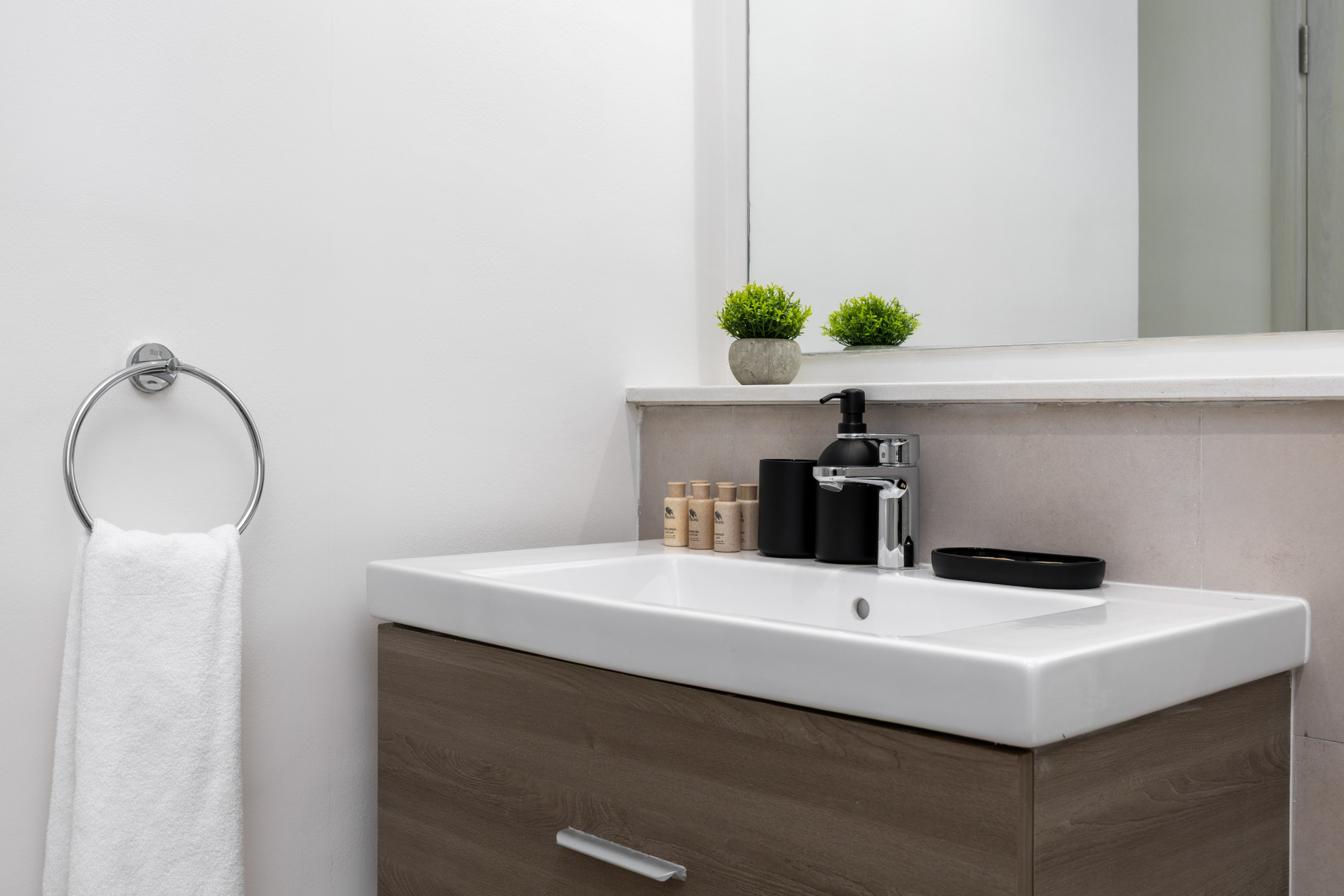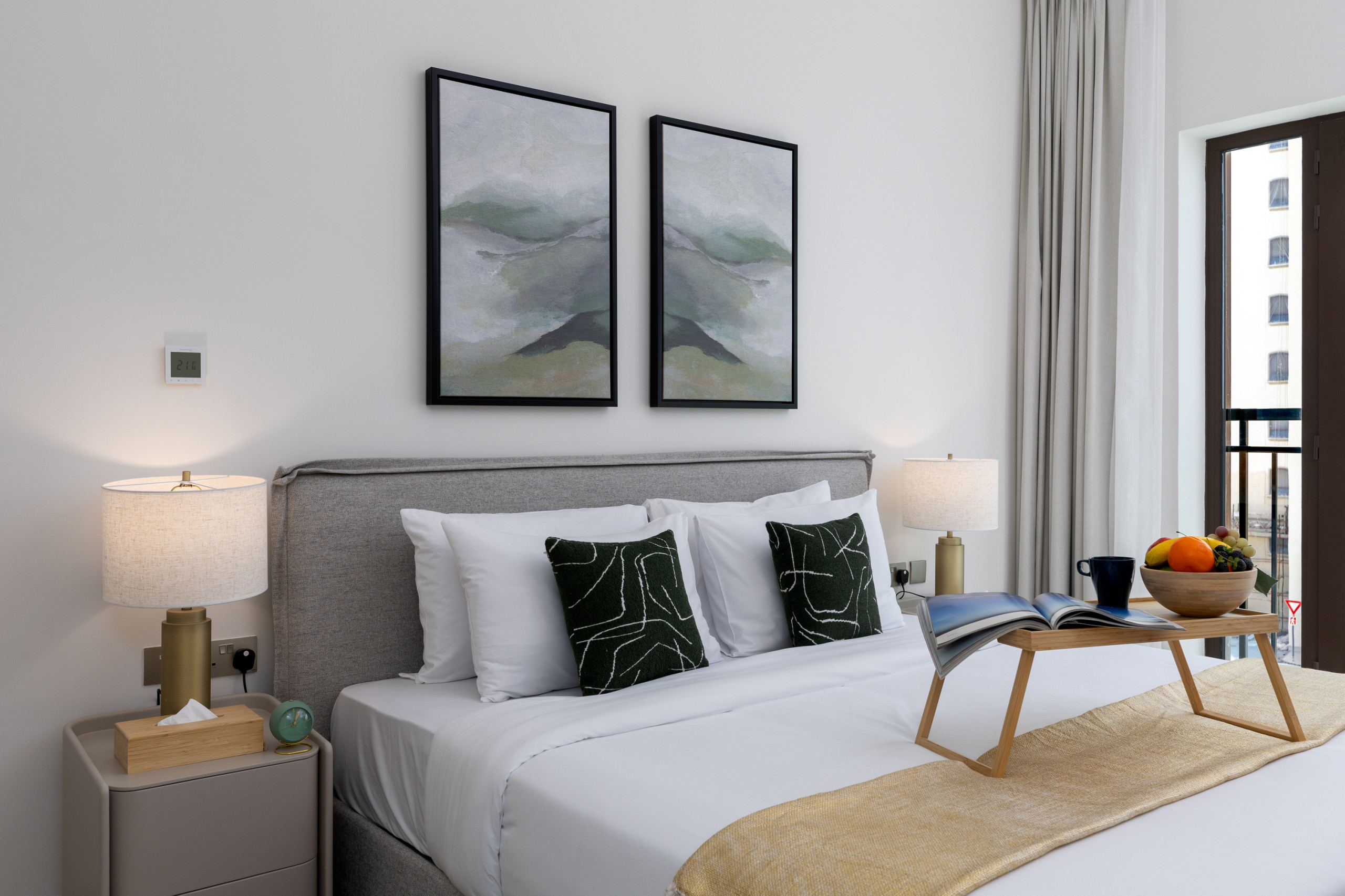 The bedroom is calm, comfortable, and thoughtfully arranged to ensure a restful stay. It features a generous super-king-size bed, soft lighting, and a neutral colour palette that enhances the sense of tranquillity. Large windows allow natural light to flow in, while built-in wardrobes provide convenient storage. The bathroom is separate from the bedroom and finished in a clean, modern style, complete with a walk-in shower and contemporary fittings, ensuring comfort and functionality.