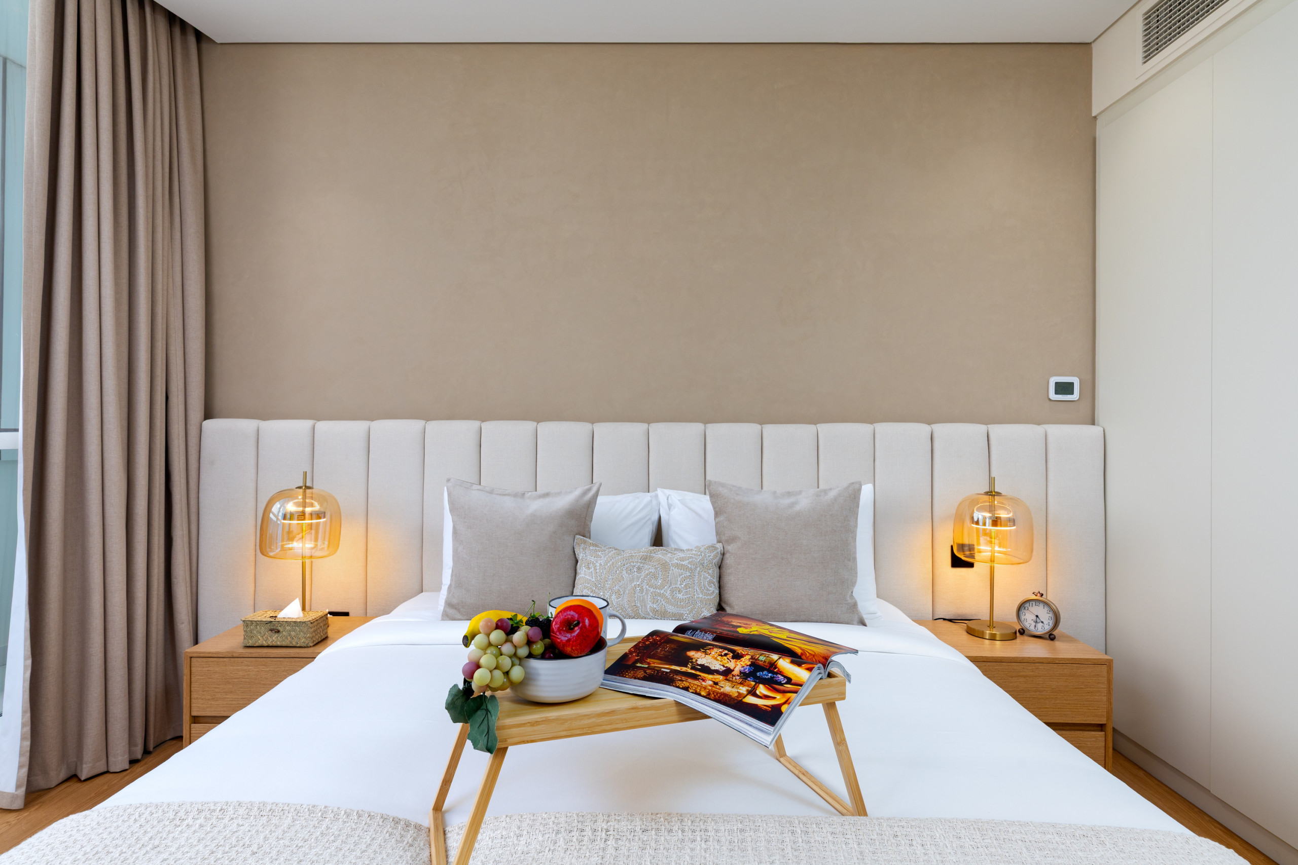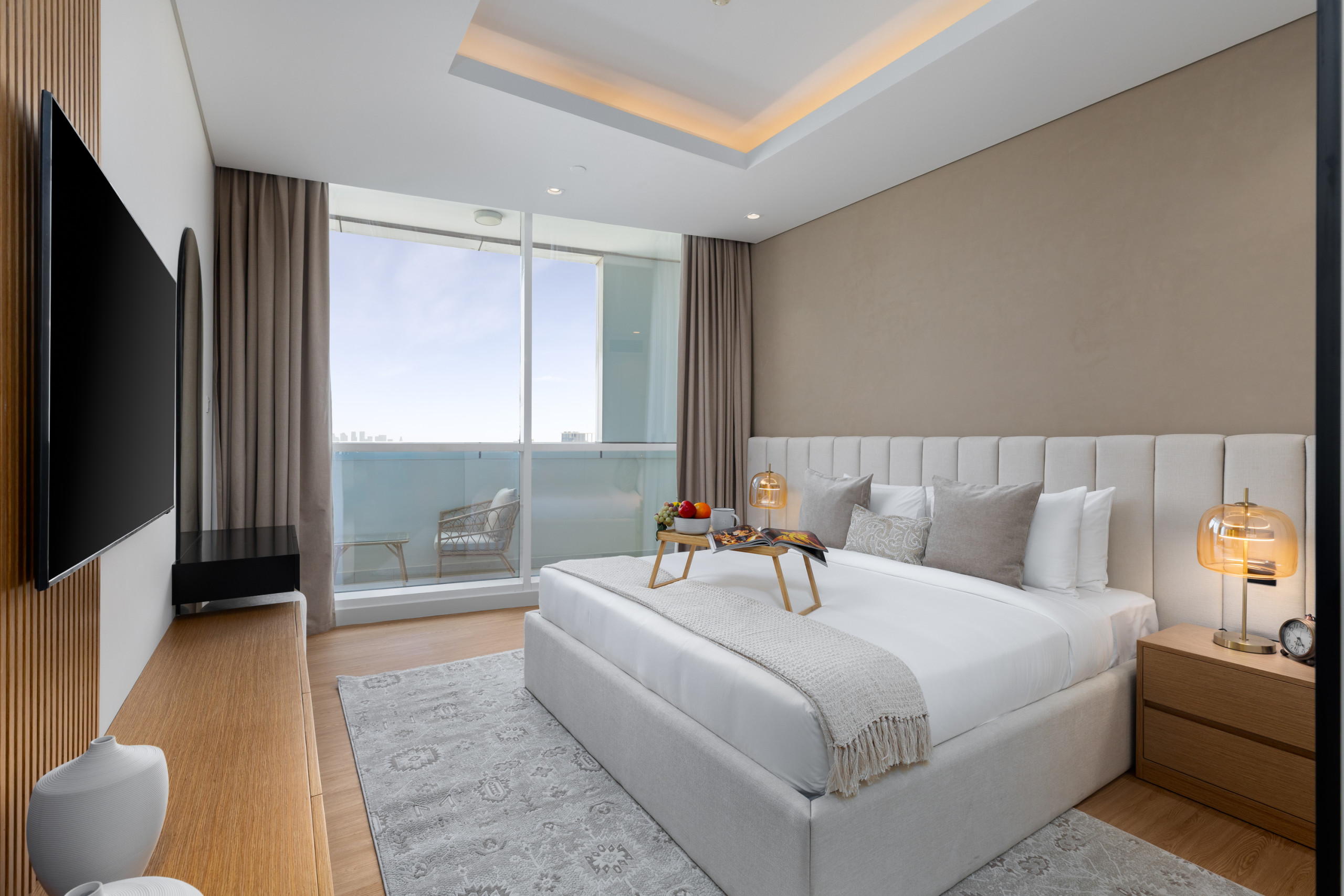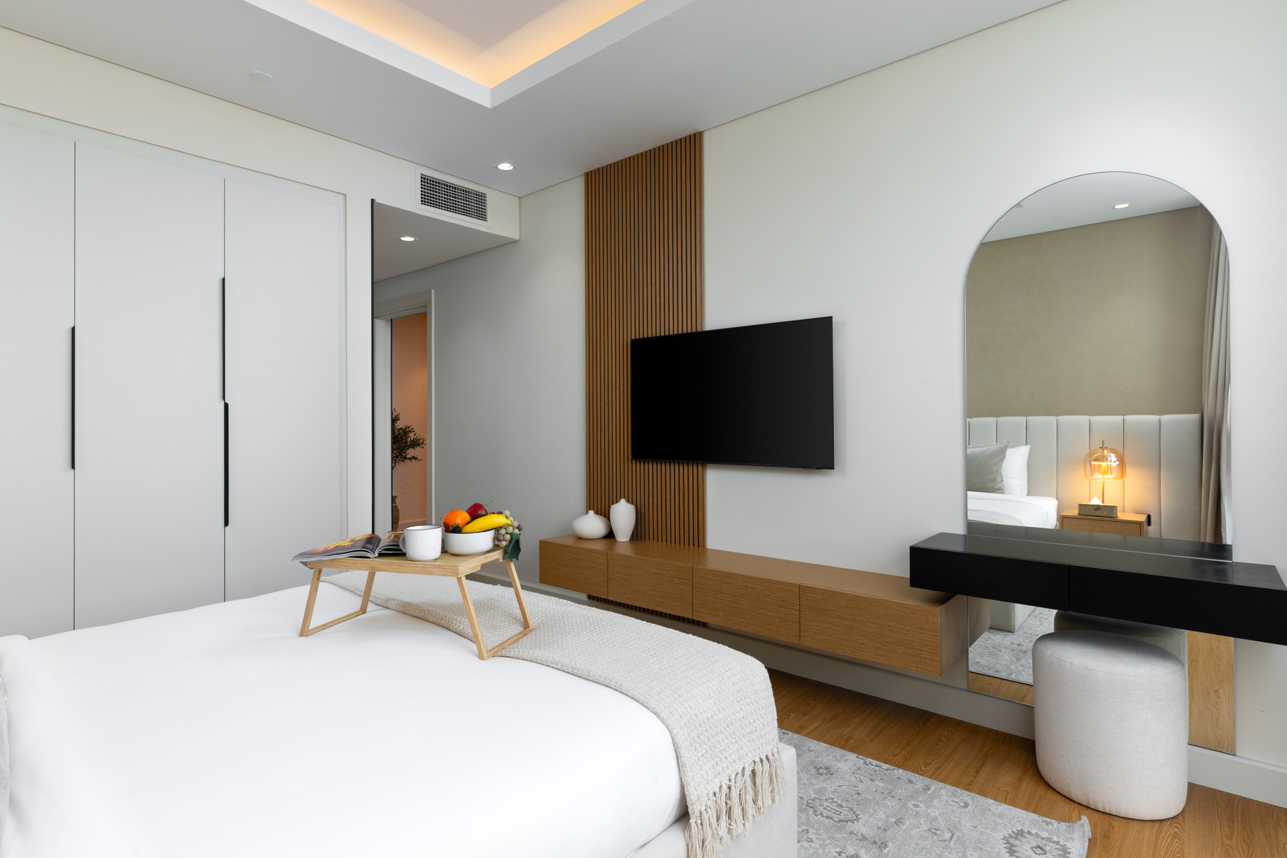The master bedroom is a peaceful sanctuary, featuring a king-size bed dressed in crisp linens, soft lighting, and soothing neutral tones that create a calm, inviting atmosphere. A stylish wall décor complements the space and incorporates a mounted TV, offering both elegance and functionality. The en-suite bathroom is finished with high-quality materials and a spacious walk-in shower, providing a private retreat to refresh and unwind.