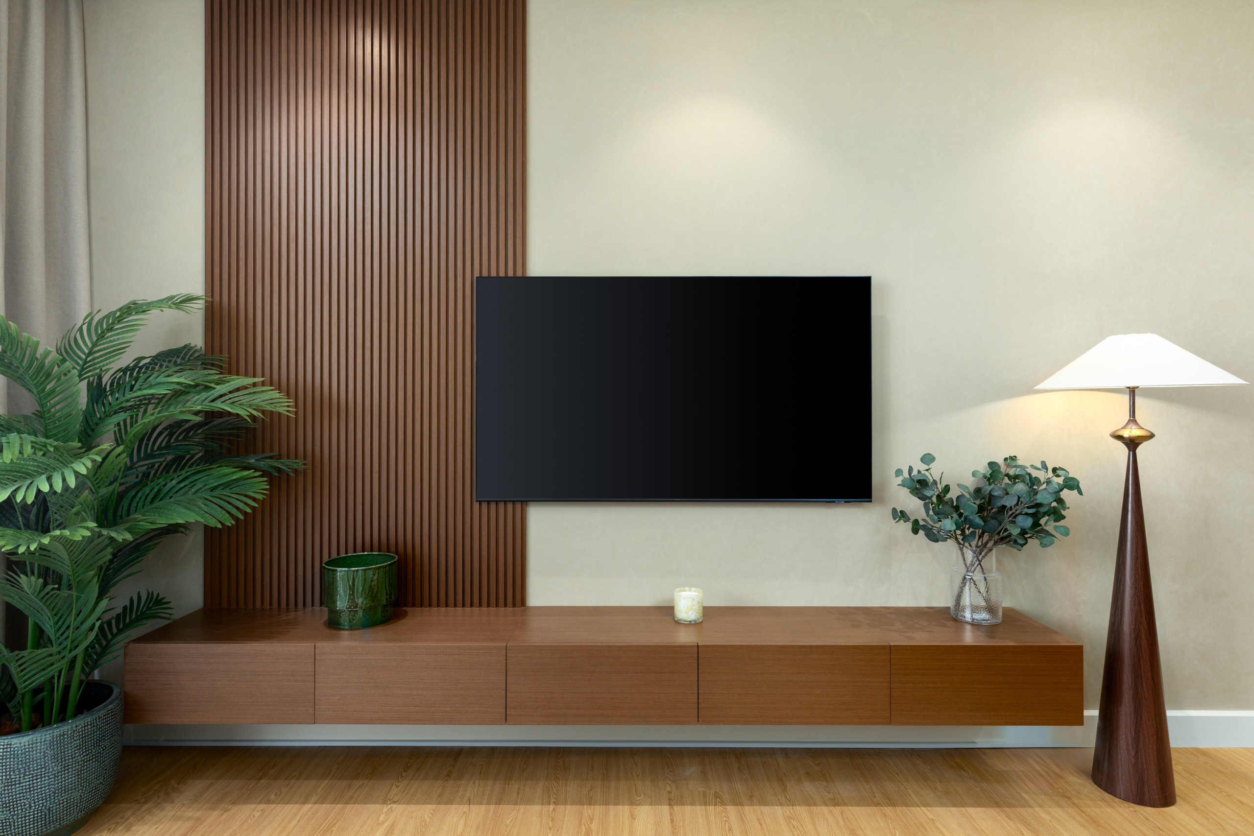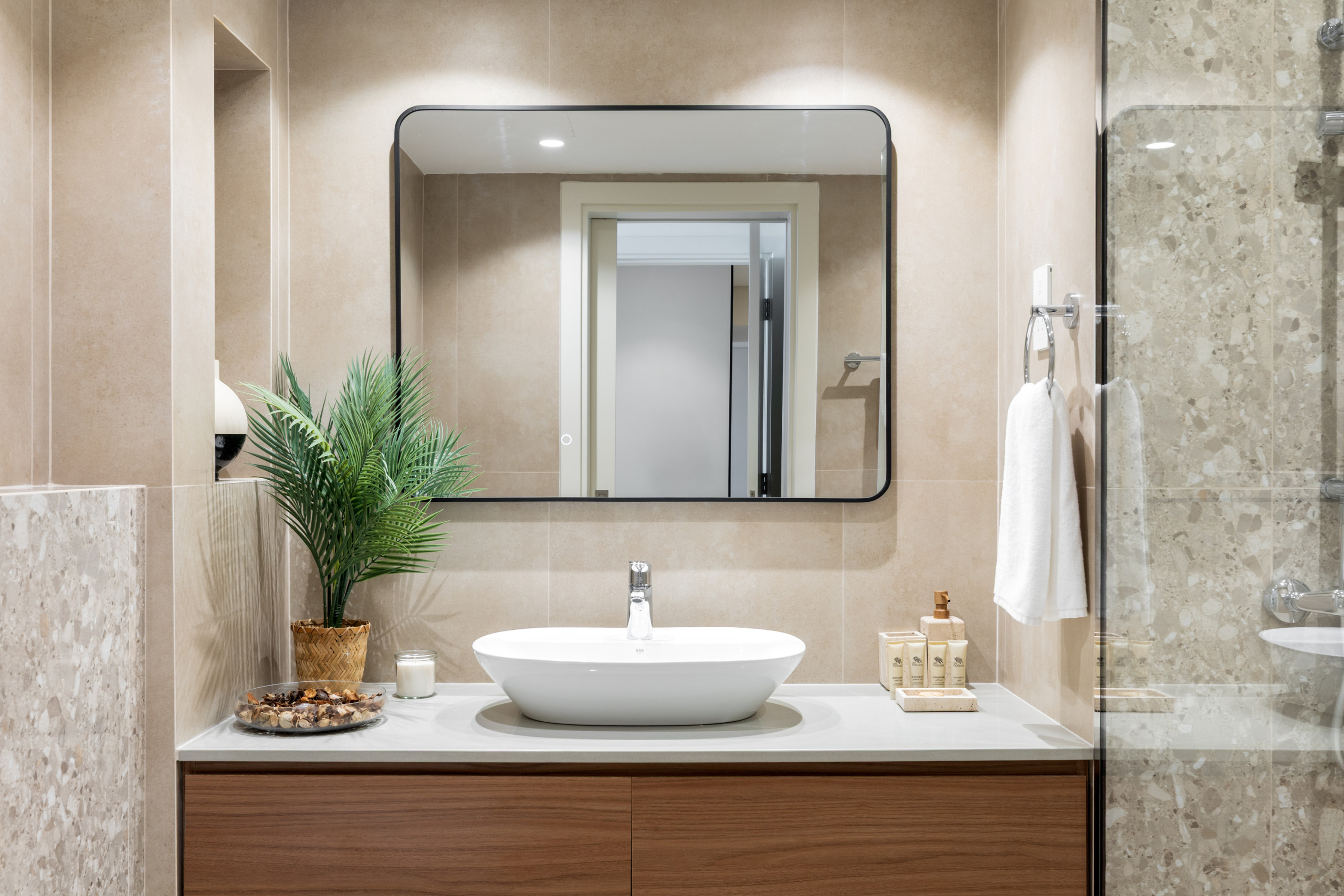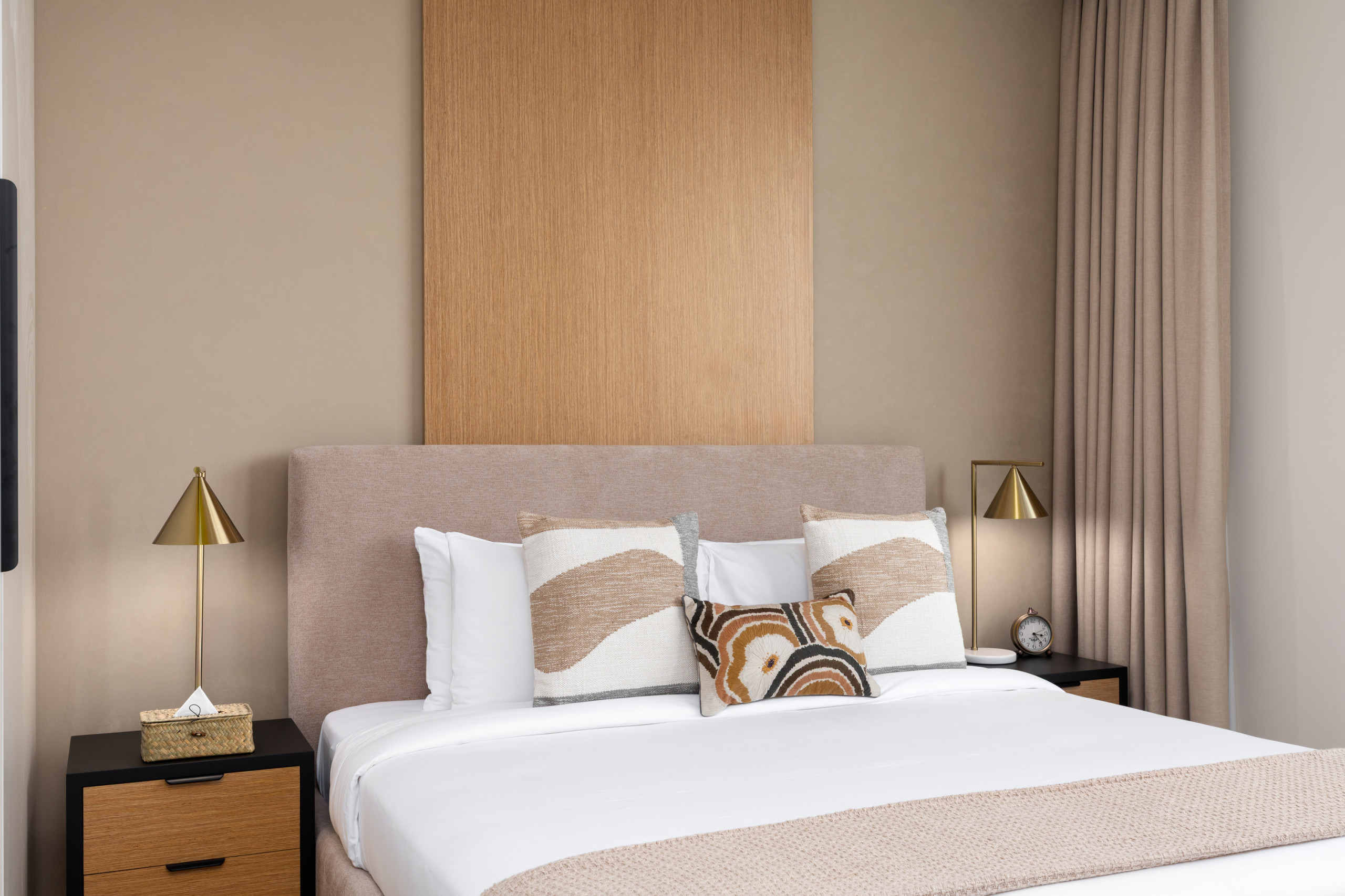 The master bedroom is a peaceful sanctuary, featuring a king-size bed dressed in crisp linens, soft lighting, and soothing neutral tones that create a calm, inviting atmosphere. A stylish wall décor complements the space and incorporates a mounted TV, offering both elegance and functionality. The en-suite bathroom is finished with high-quality materials and a spacious walk-in shower, providing a private retreat to refresh and unwind.