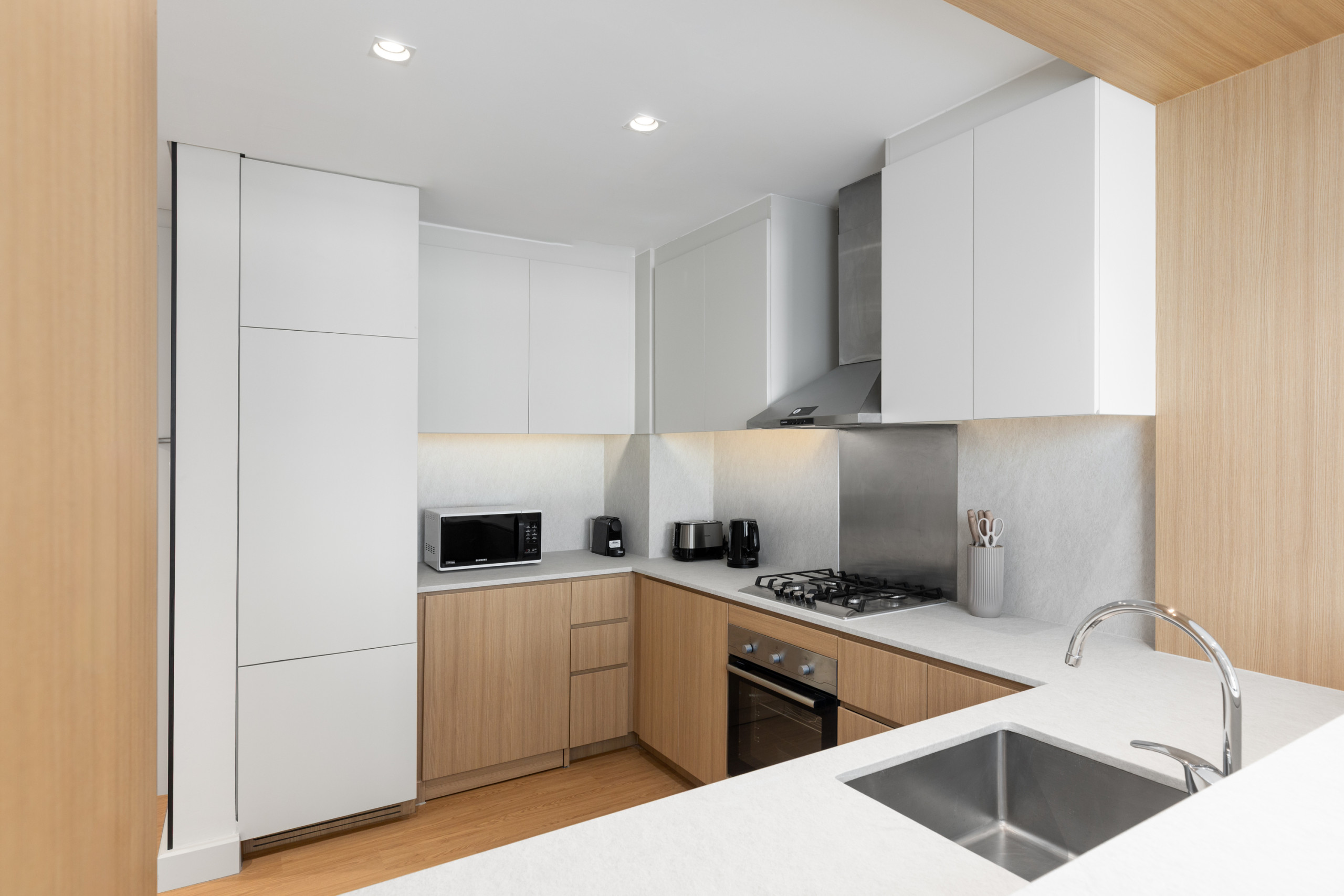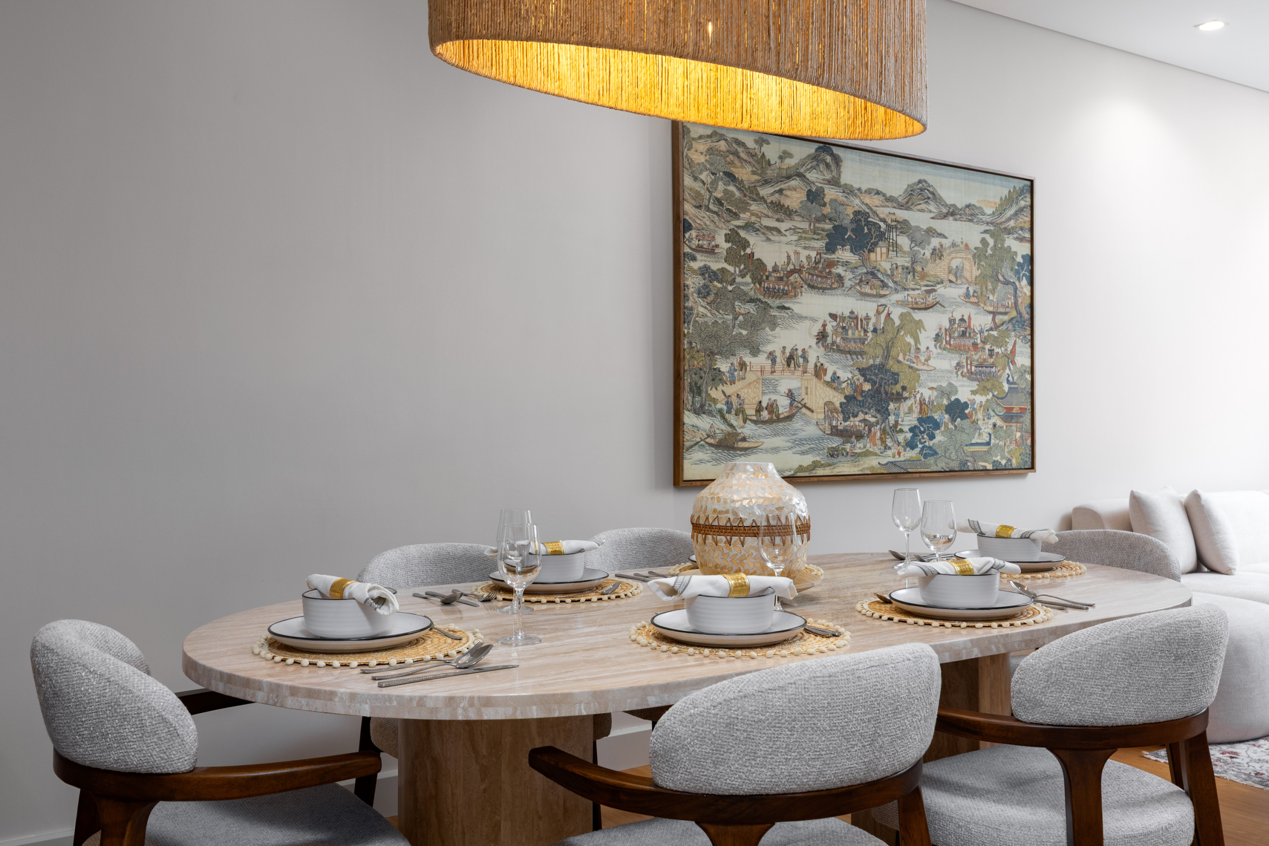 Step into a contemporary oasis, where soft grey tones create a tranquil atmosphere that contrasts beautifully with the vibrant energy of the city outside. The living area is elegantly appointed with a sleek, modern L-shaped sofa, a chic coffee table, and a polished TV unit, infusing the space with a sense of refined comfort. Adjacent to this inviting lounge is a stylish dining area, designed to host up to six guests with ease.