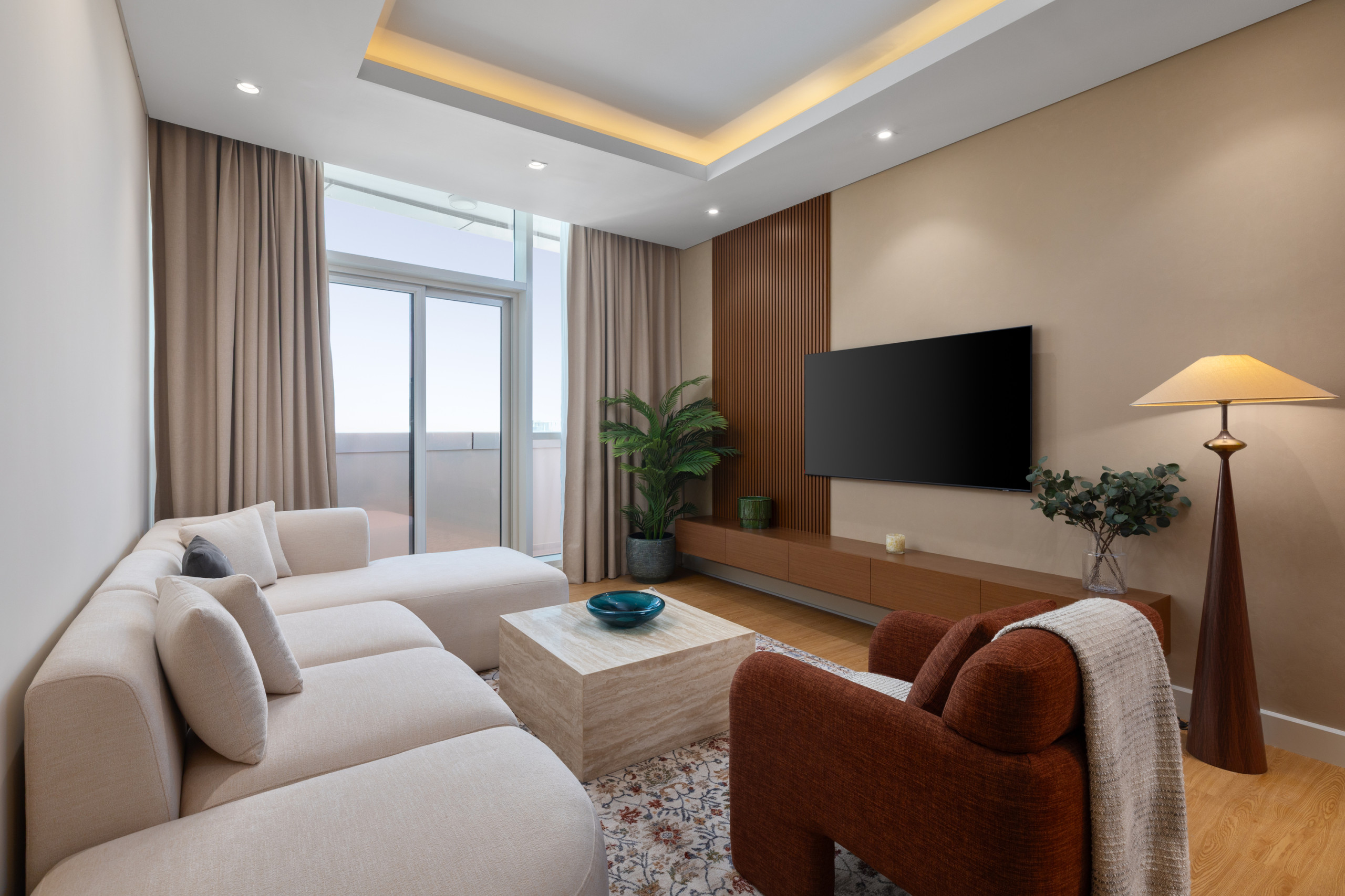 The open-plan living area is inviting and modern, featuring a plush L-shaped sofa paired with an elegant terracotta accent chair for a cozy yet sophisticated lounge experience. Floor-to-ceiling windows flood the space with natural light and open to a wraparound balcony, offering sweeping city views and a side glimpse of Burj Khalifa—perfect for enjoying the skyline any time of day.