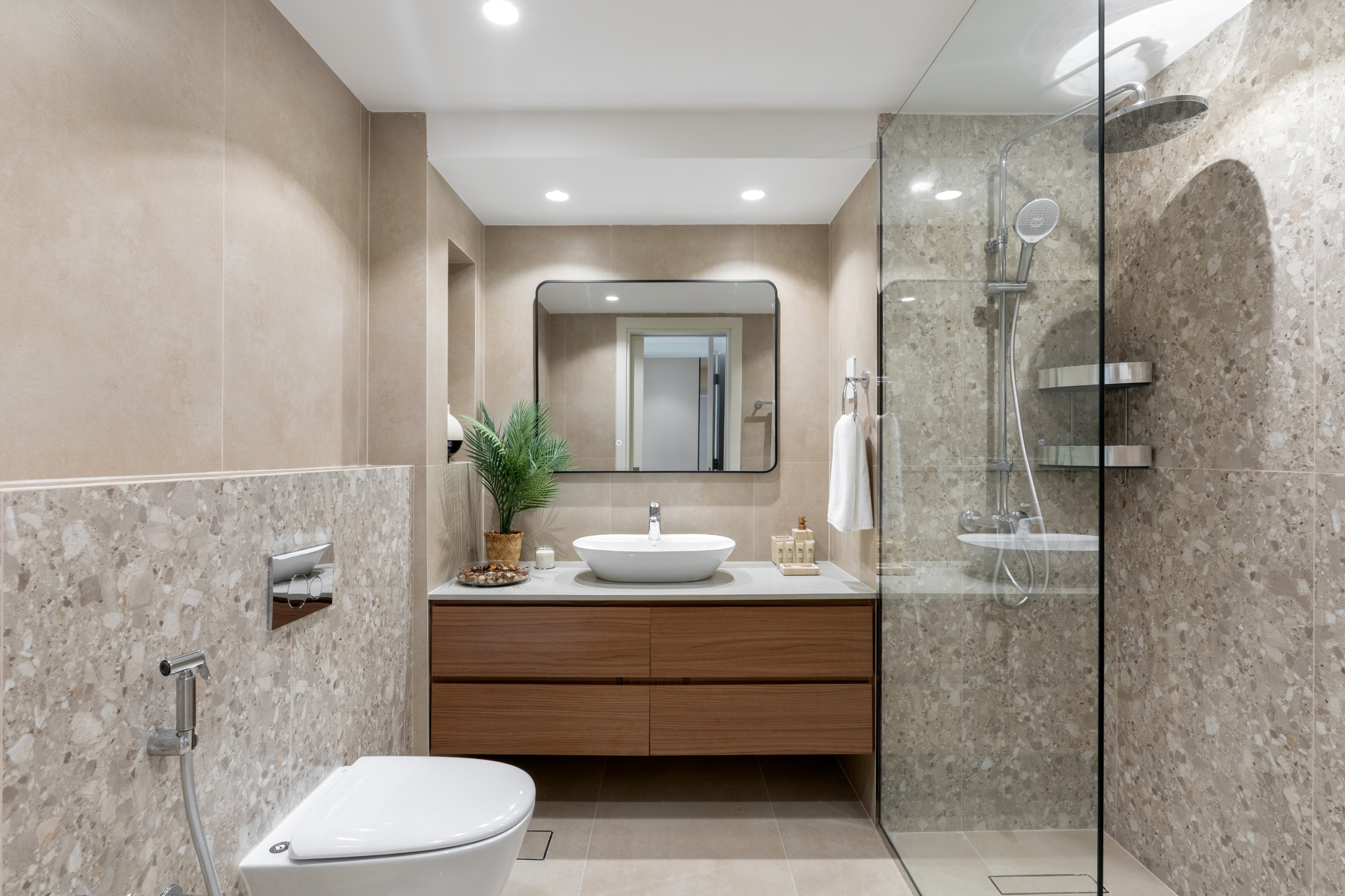 The second bedroom combines style and functionality, featuring a king-size bed and a featured wall with a small vanity and mirror, perfect for personal grooming or adding a decorative touch. Natural light and subtle decor create a serene ambiance, while the en-suite bathroom with a walk-in shower and sleek finishes completes this comfortable, spa-like retreat.