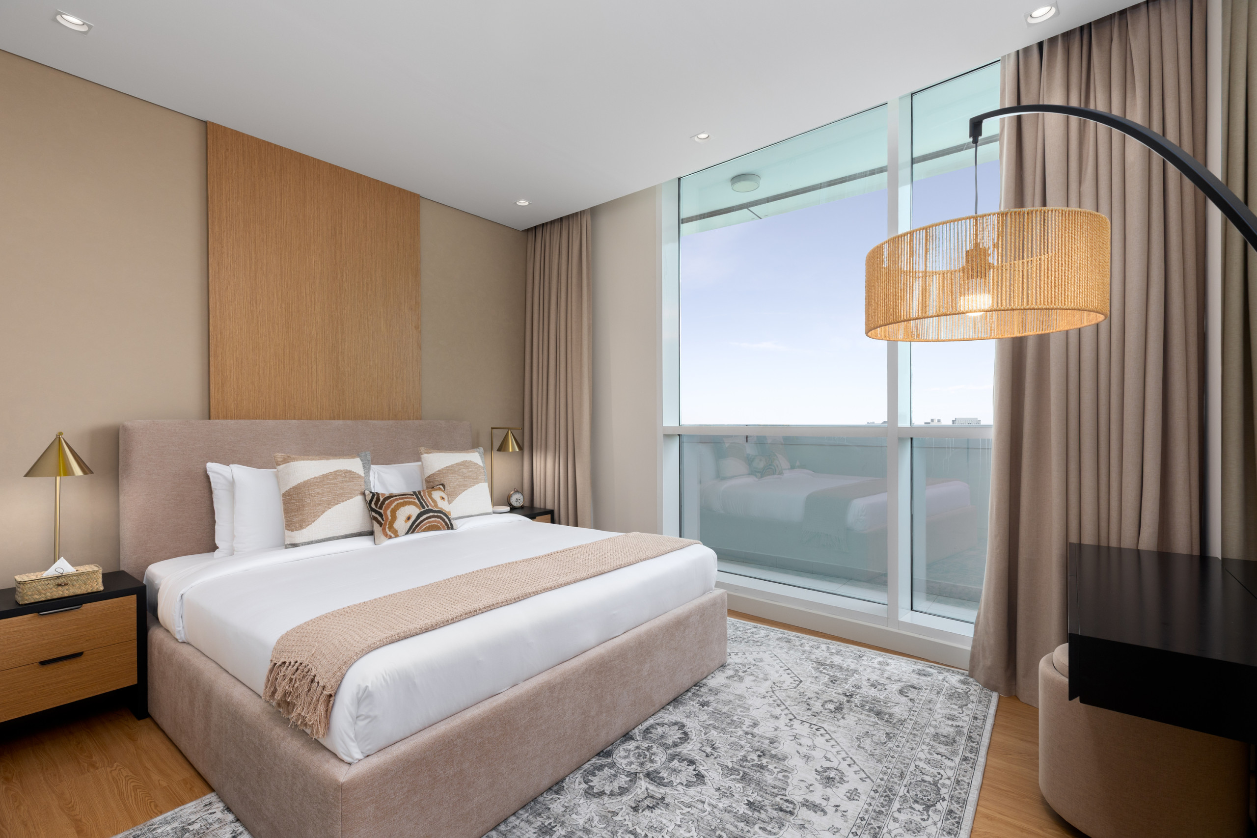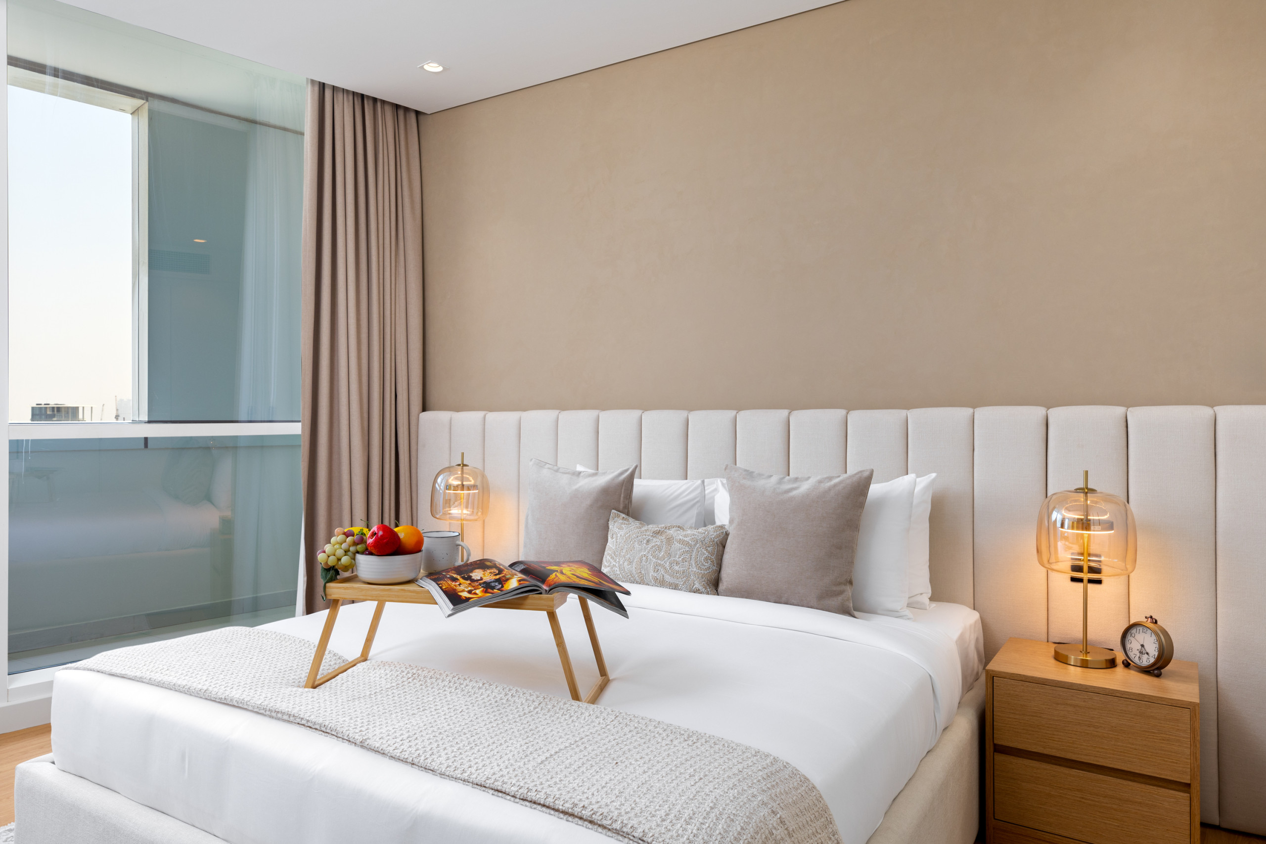 Both bedrooms are thoughtfully designed with comfort and style in mind. The master offers a plush king-size bed and elegant decor, while the second bedroom is enhanced by a featured wall with a small vanity and mirror, adding a touch of charm and functionality. The balcony frames city views, including a subtle glimpse of the iconic Burj Khalifa, making this apartment a serene urban retreat.