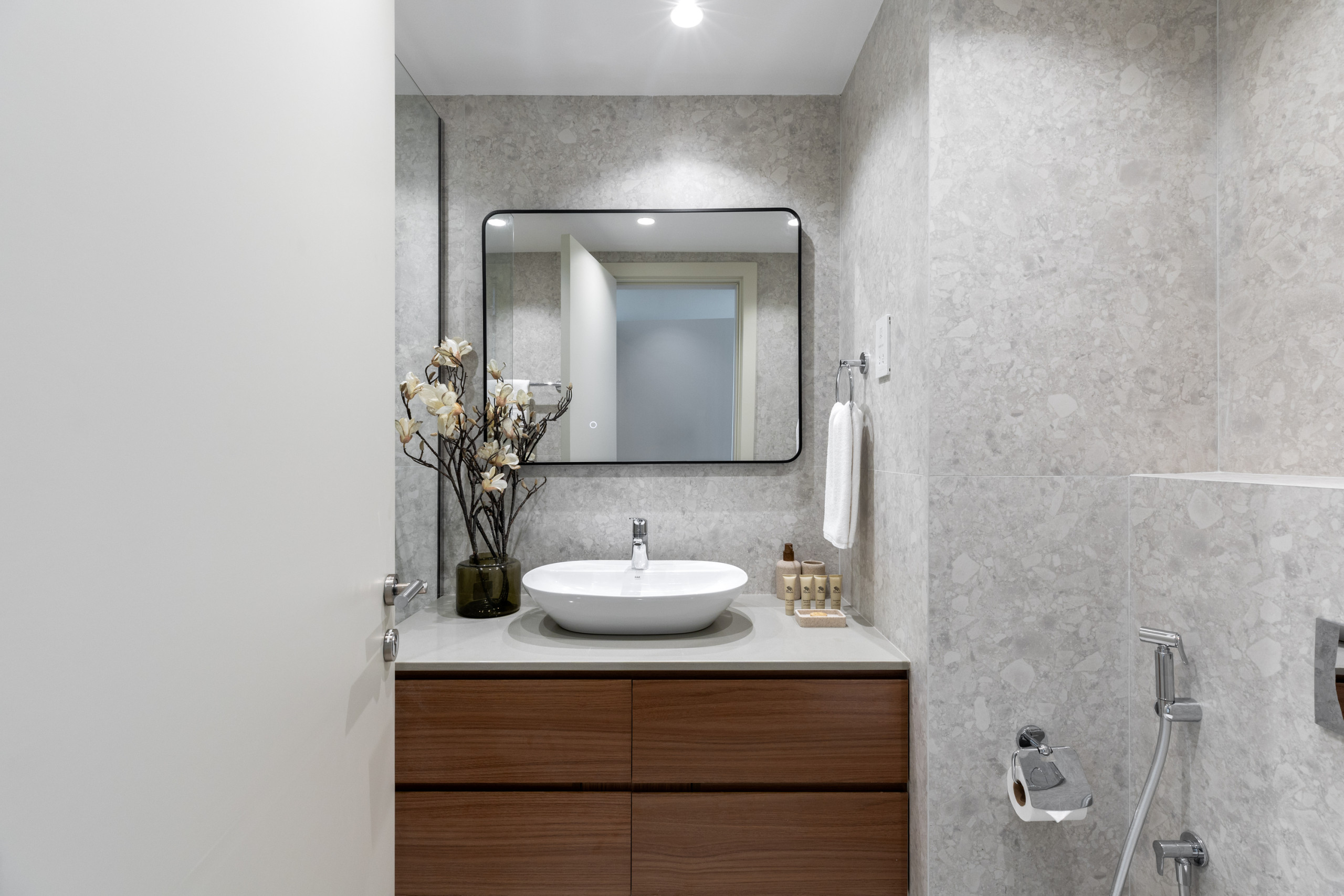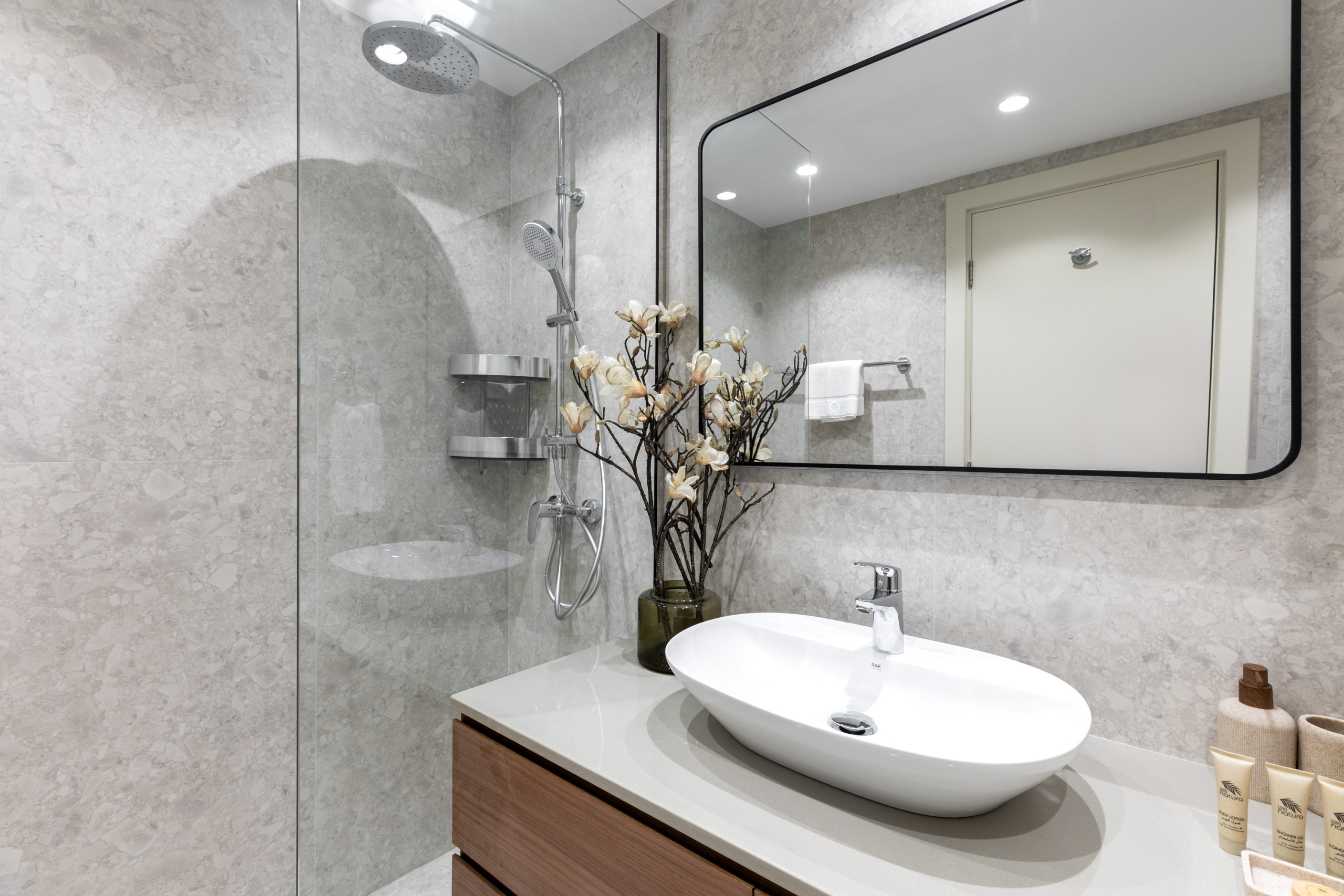 Enter the second bedroom, where guests are indulged with a queen-size bed and captivating views of the iconic Burj Khalifa from every angle. The space is carefully curated with fashionable bedside tables and bespoke lamp lighting, striking a harmonious balance between creativity and tranquillity. The artwork captures elements of the UAE desert landscape, adding warmth and intensity to the overall space. Just opposite the bedroom entrance, you’ll find the dedicated bathroom, thoughtfully designed to ensure your utmost comfort and convenience. Adorned with a marble vanity unit and equipped with a walk-in shower, this bathroom provides a luxurious retreat within arm’s reach.
