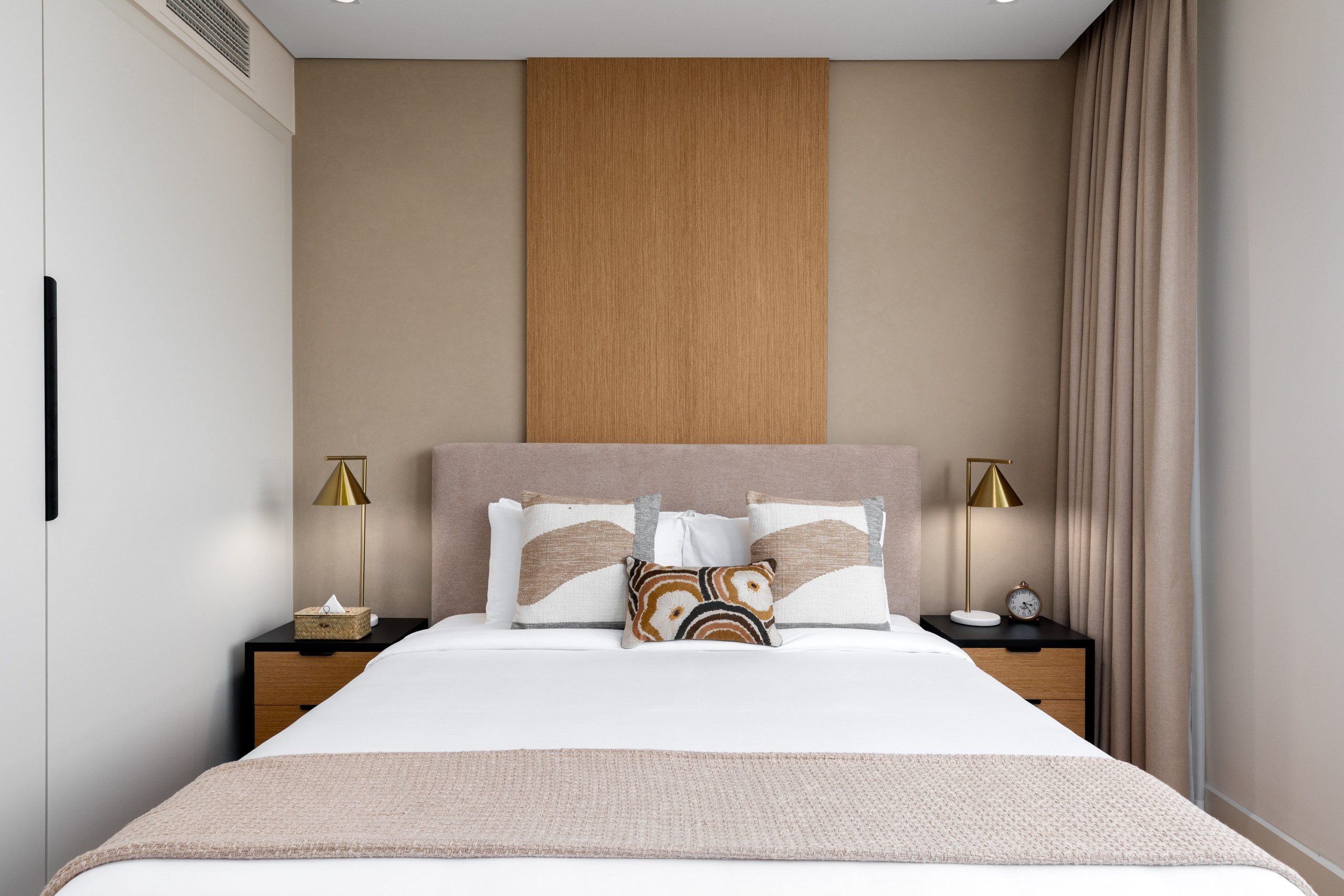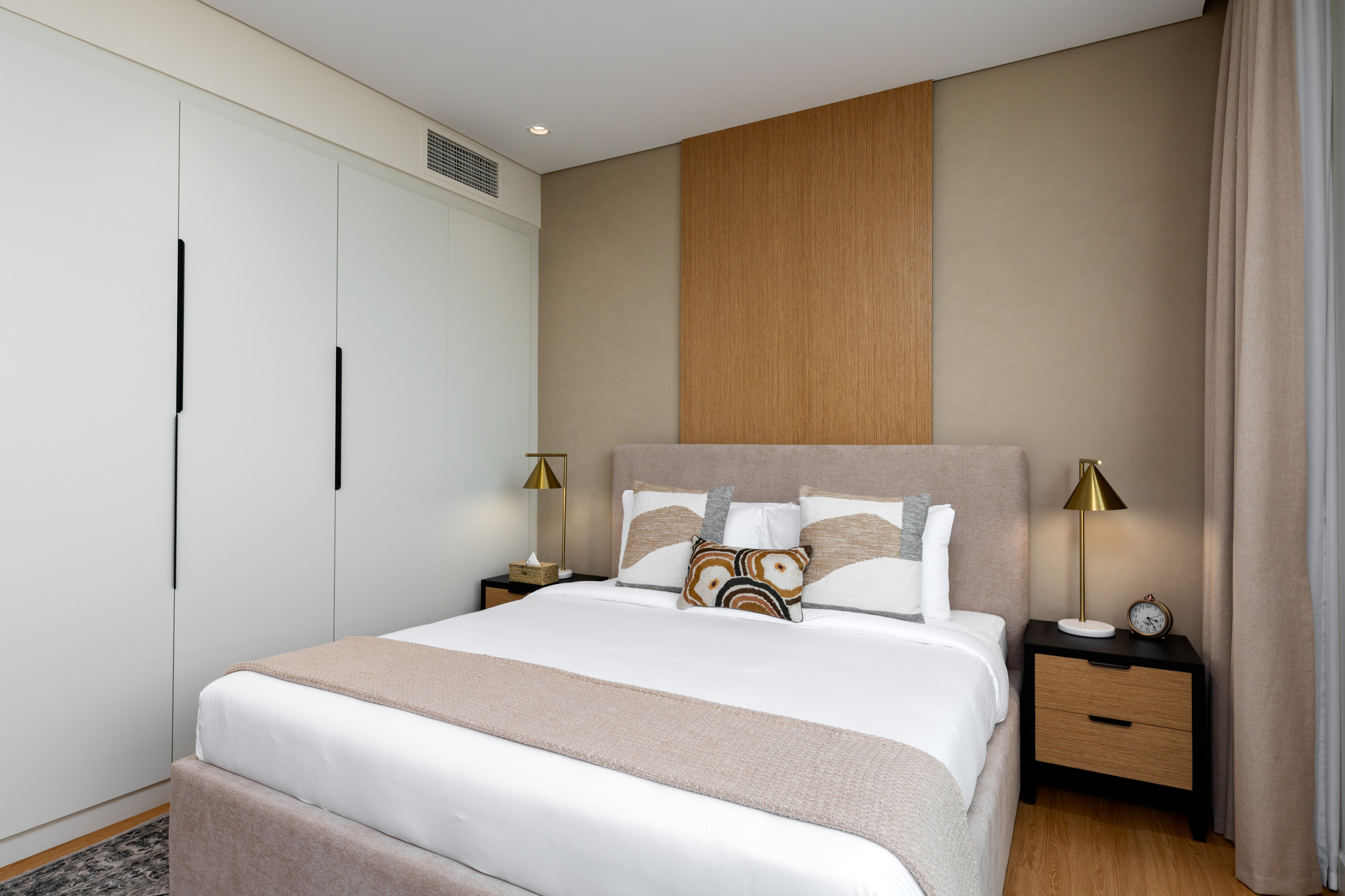 Embodying a contemporary aesthetic, the second bedroom offers a serene and elegant retreat. At its centre is a cosy queen-sized bed, adorned with luxurious premium bedding, complemented by bedside tables and warm lamp lighting that creates a peaceful ambience. Opposite the bed, the wall showcases floor-to-ceiling built-in wardrobes, with a sleek vanity space in the middle, complete with a mirror for added functionality. This welcoming bedroom also features a dedicated bathroom, designed with your comfort in mind, offering a relaxing bathtub and a spacious vanity unit for ultimate convenience.