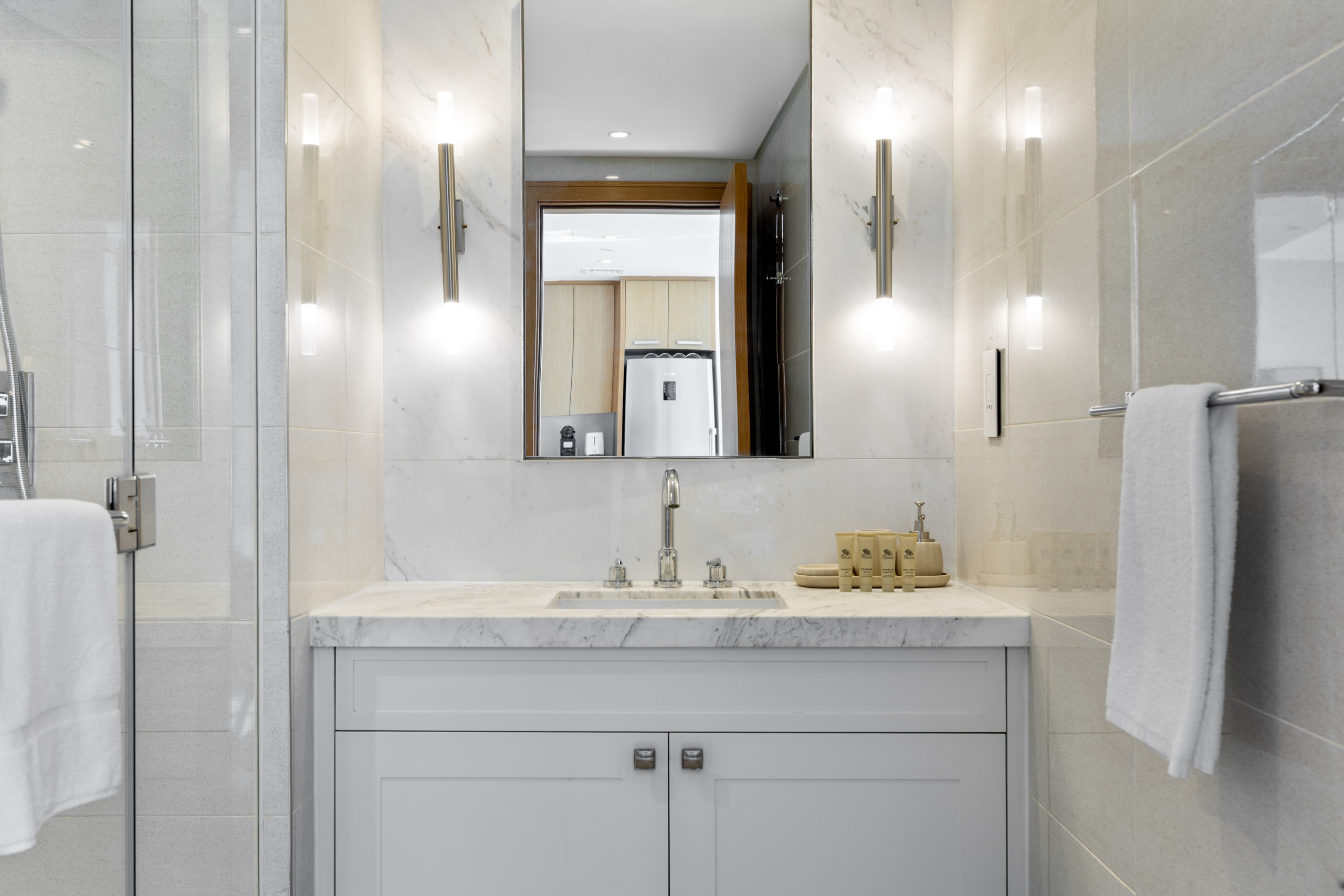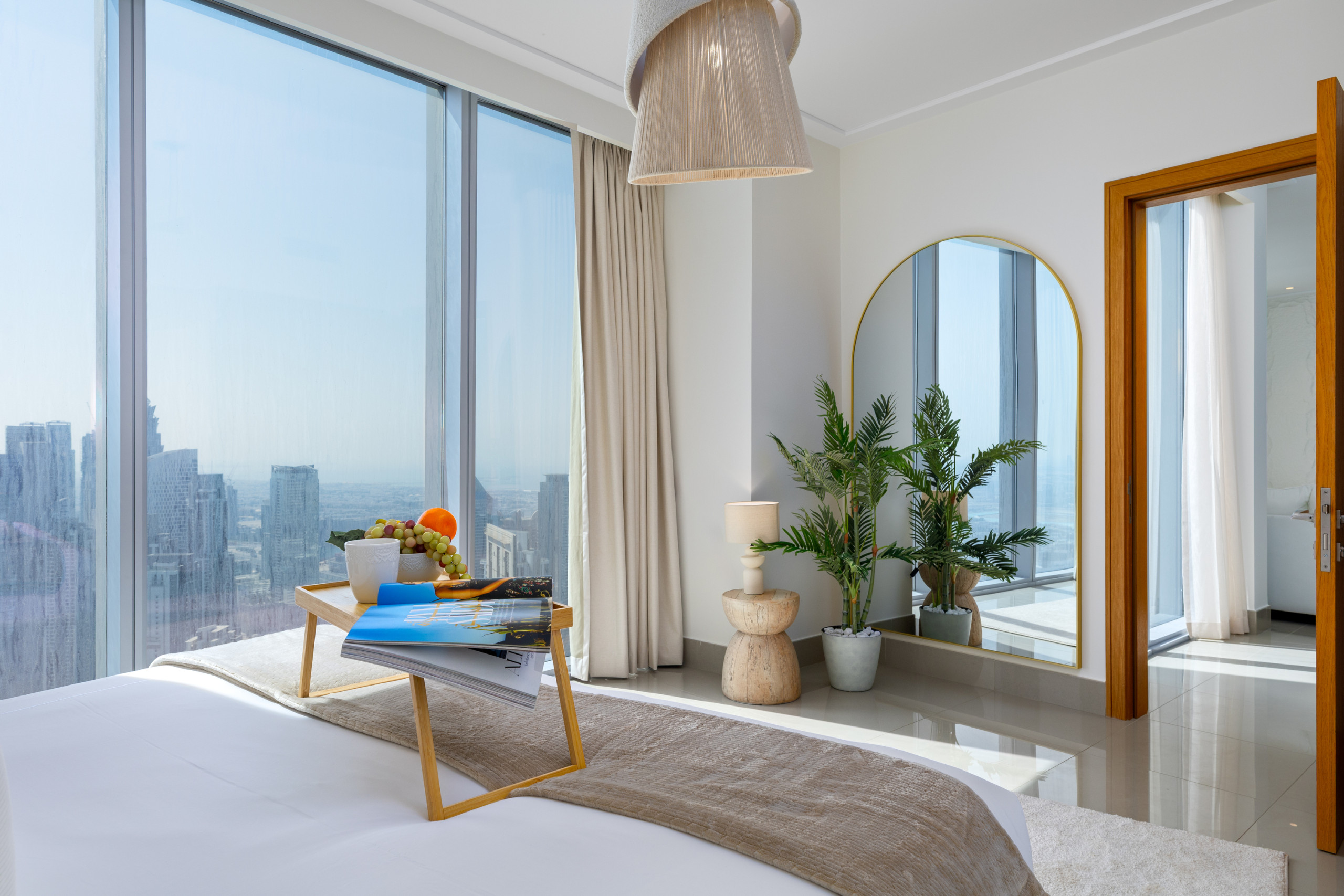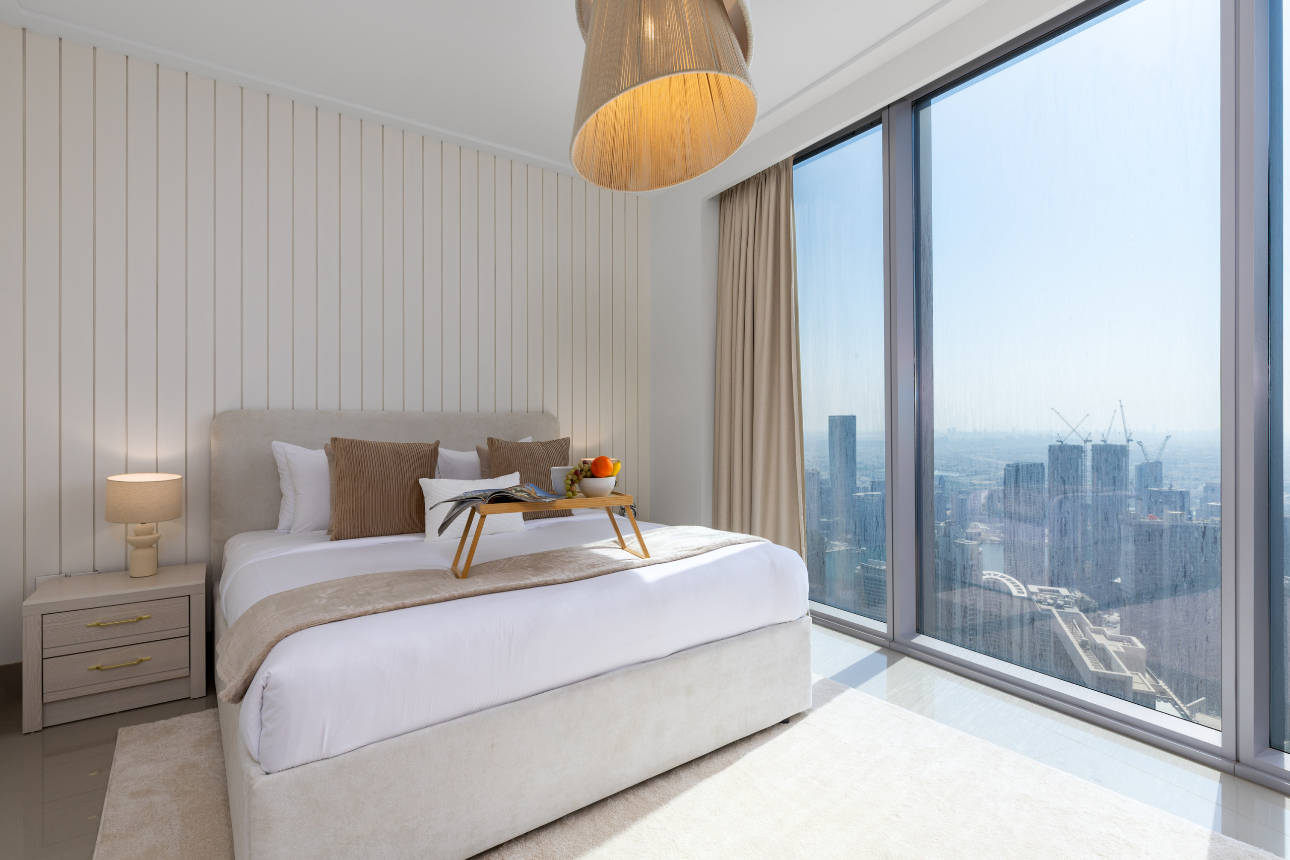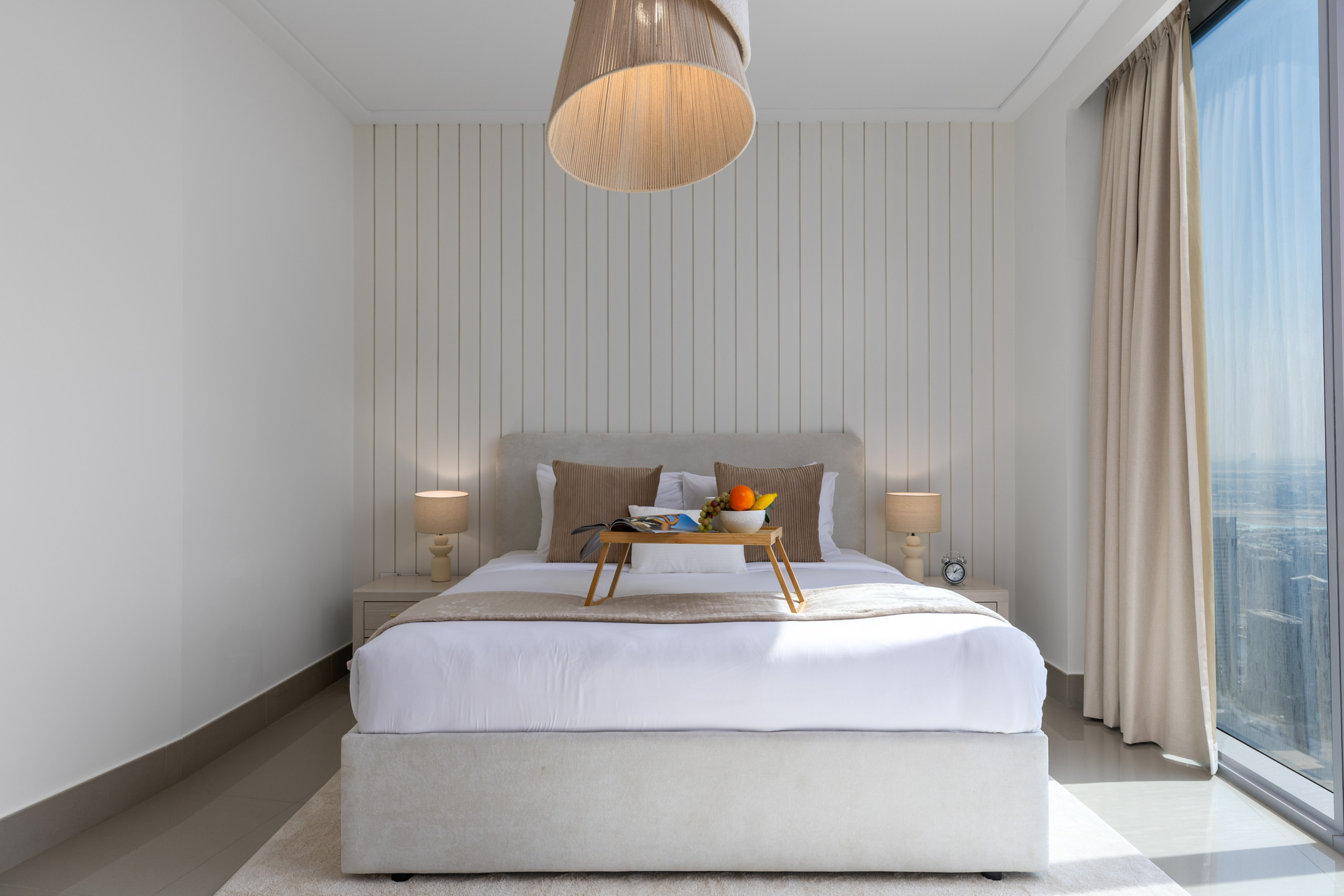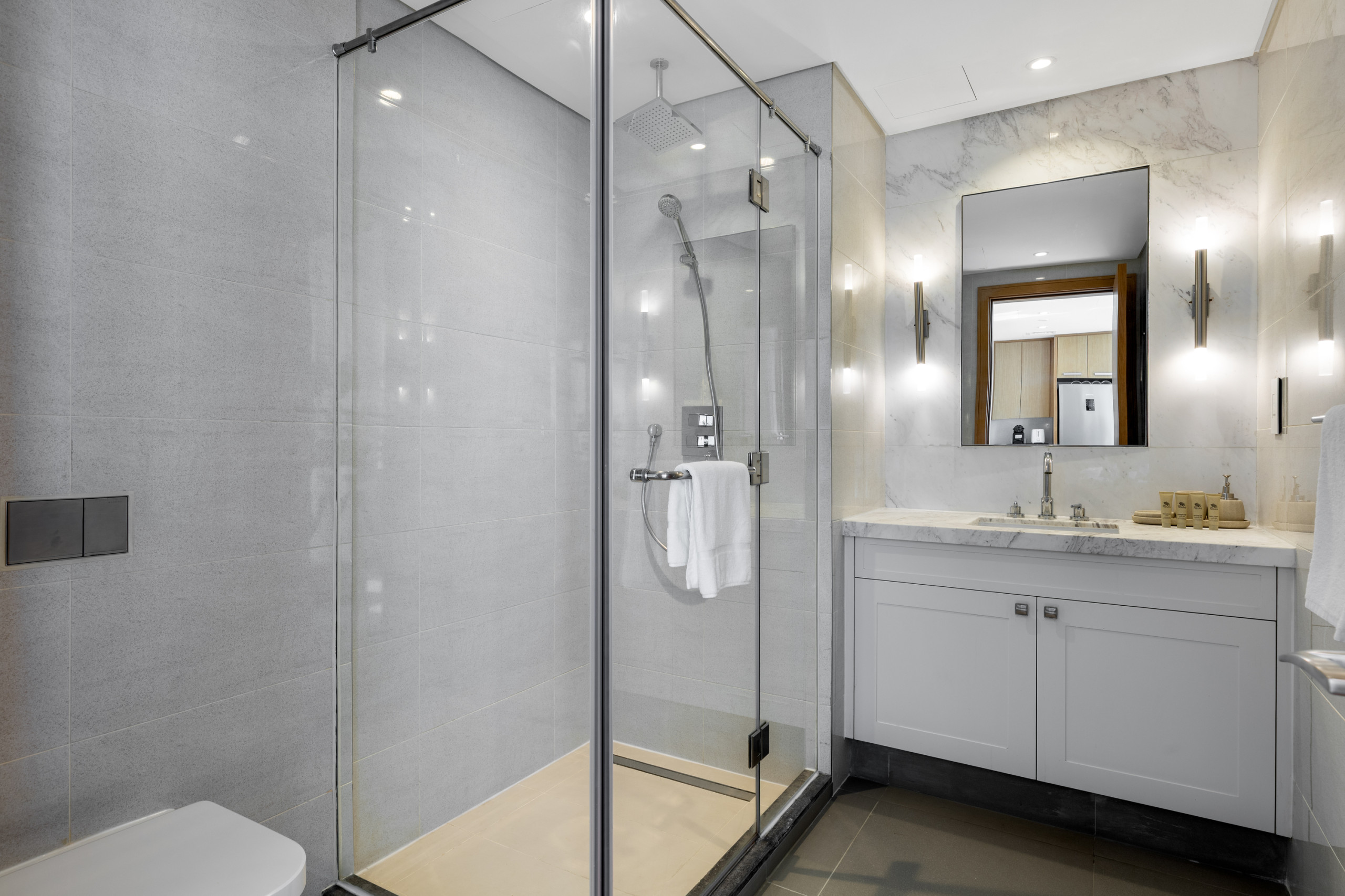 The bedroom is a private sanctuary designed for comfort and calm. With its plush king-size bed and soothing colour palette, it invites restful nights and peaceful mornings. From the window, enjoy sweeping skyline views that remind you you’re in the heart of Dubai’s most vibrant district. This bedroom perfectly blends modern design with urban sophistication, offering a refined stay high above the city, ideal for guests seeking style, comfort, and an unforgettable view. The bathroom, conveniently located outside the bedroom, features a large glass-enclosed walk-in shower and elegant finishes, offering a refreshing and spa-like experience.