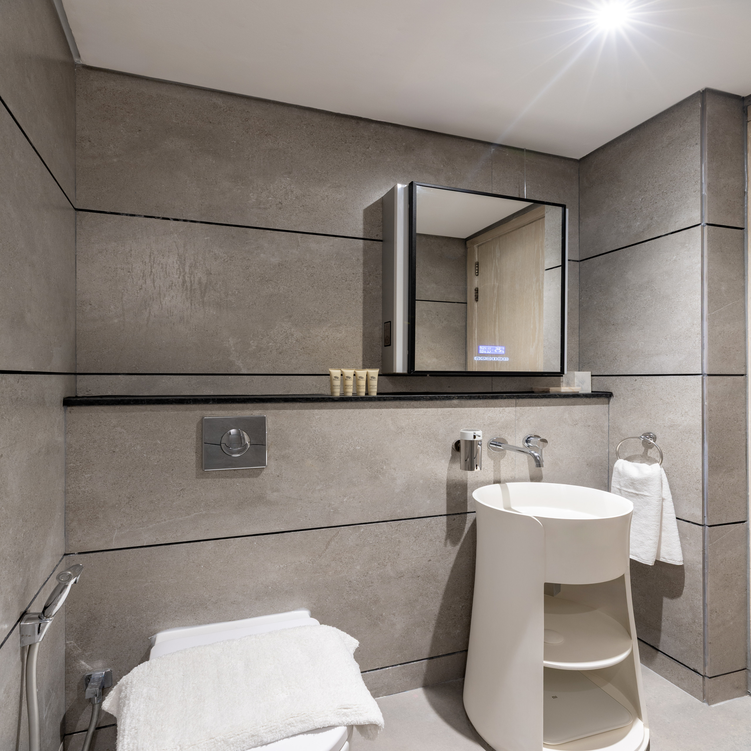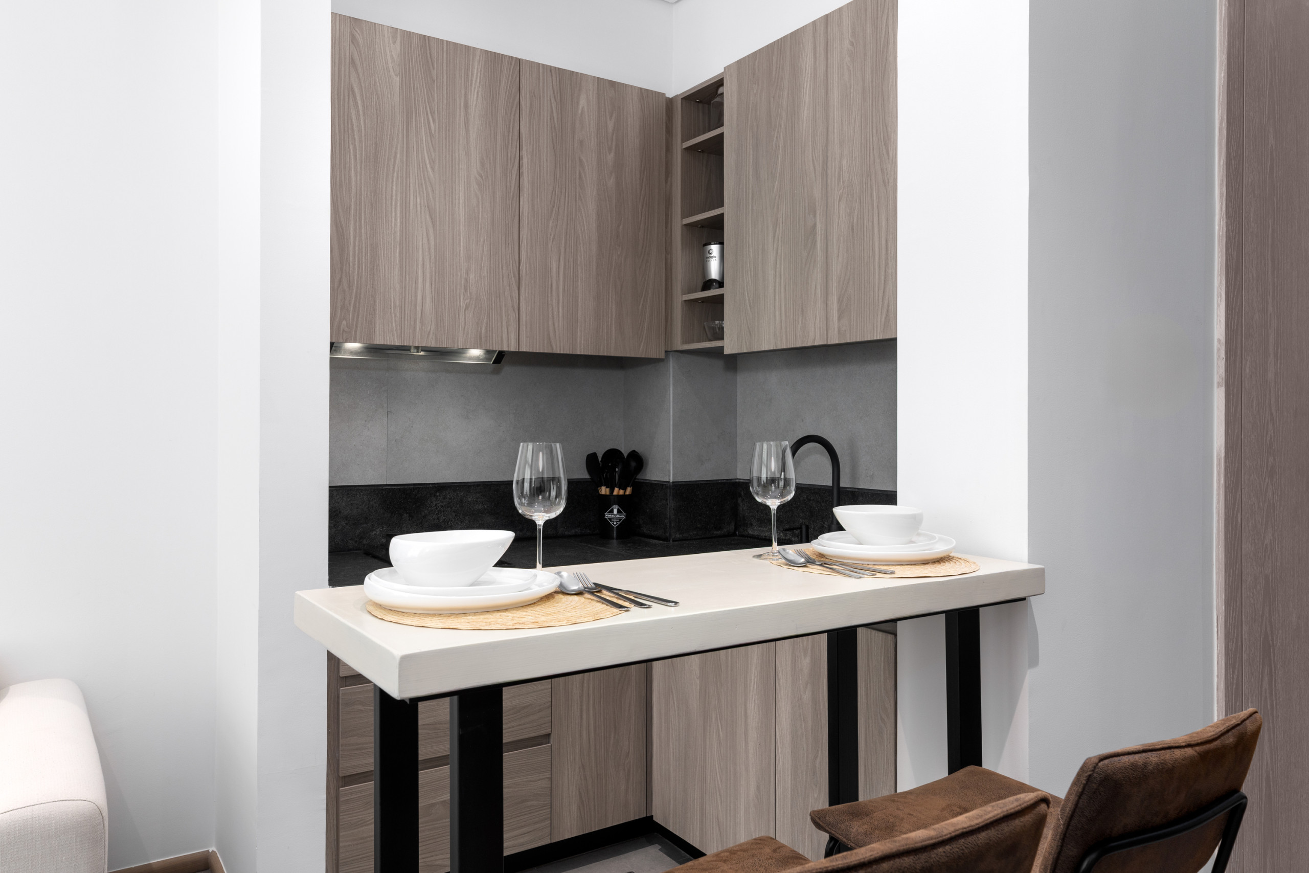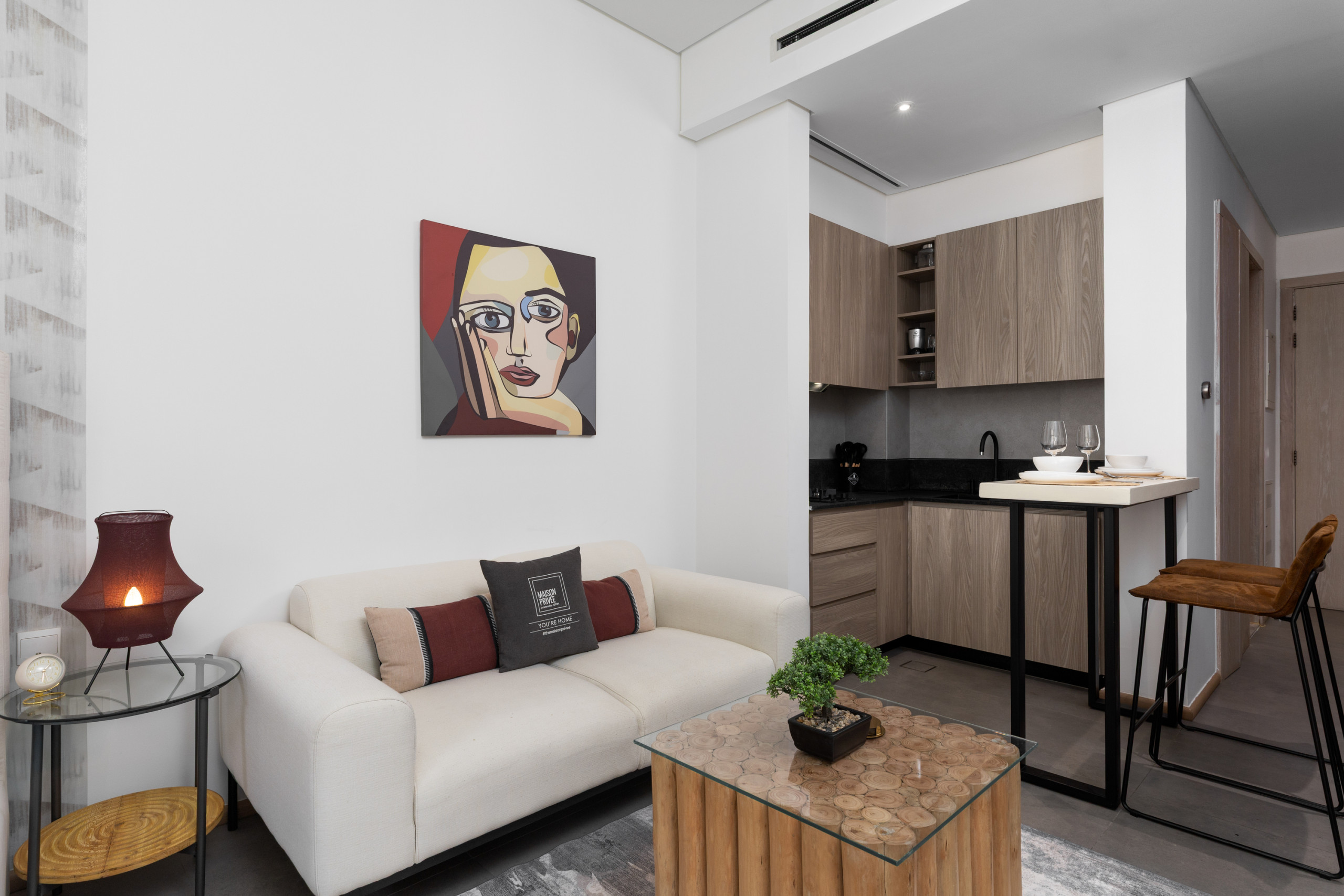 Thoughtfully designed, this premium studio apartment offers all you need in one space; featuring a lounge area with large sofa and pouffe, coffee table and flat-screen TV and a king-sized bed with a view, situated next to the apartment’s floor to ceiling furnished windows, dressed in premium bedding, bedside tables and lamp lighting. The space has a dining table to seat two and a one-wall kitchen with all the amenities needed for a seamless stay.