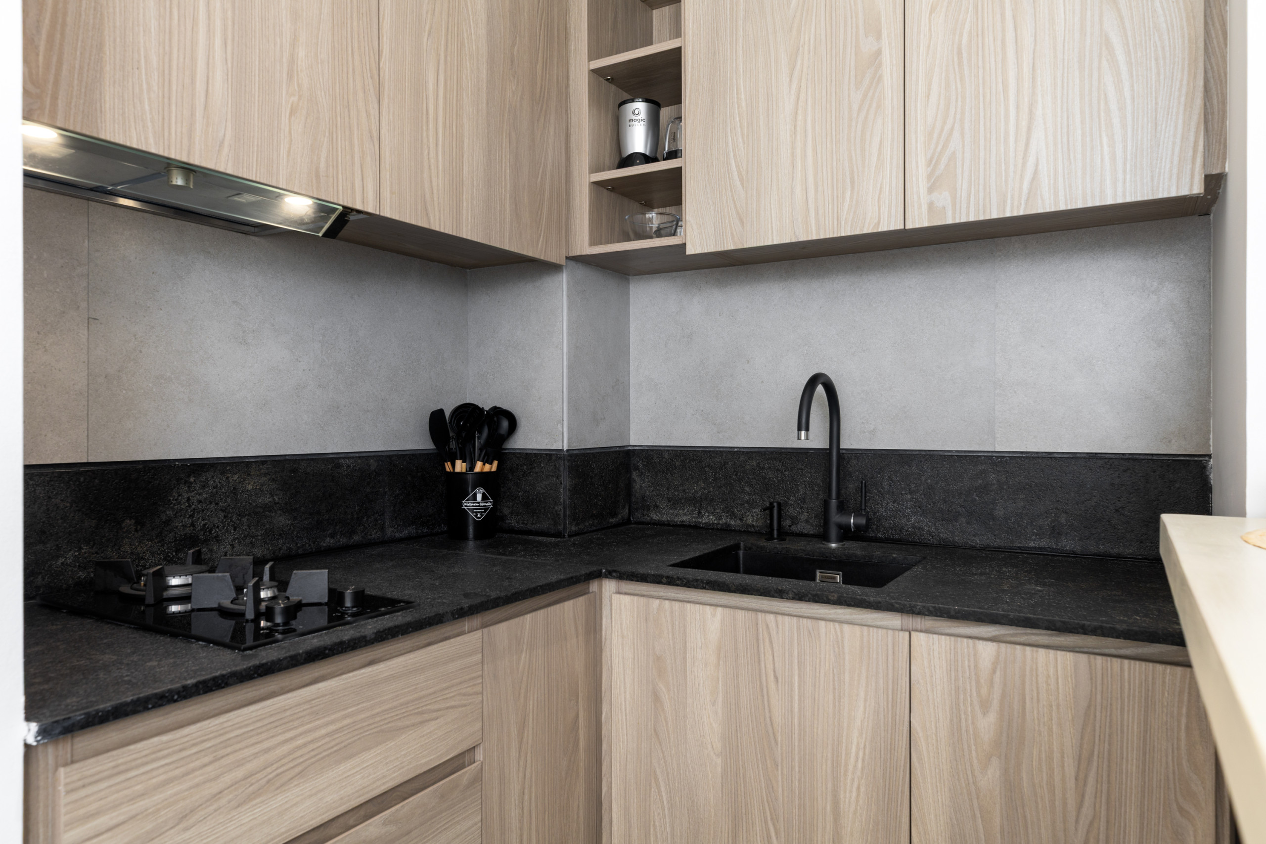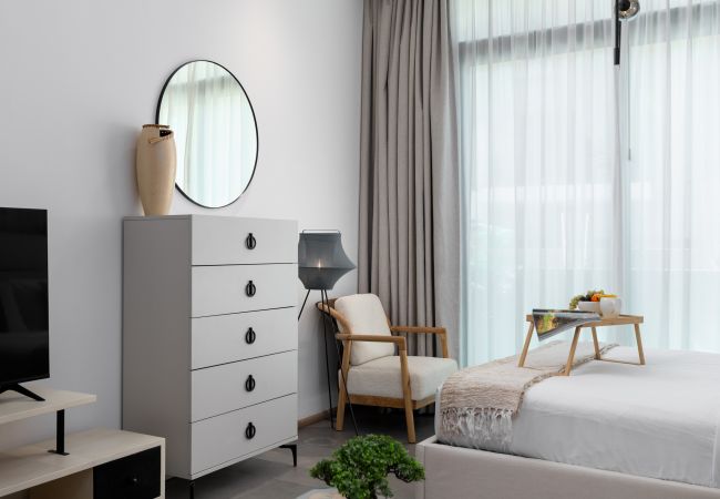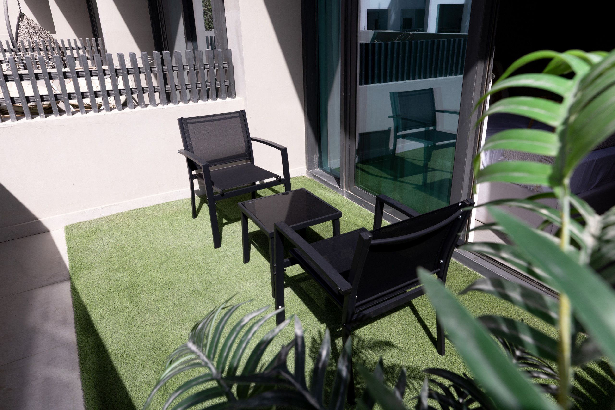 This bright studio has been designed to maximize both comfort and functionality. The open-plan layout features a queen-size bed with a cozy sofa by its side, creating a comfortable space to unwind or watch your favorite shows. A wall-mounted vanity with TV unit and wardrobe adds both style and practicality, making the apartment feel spacious and well-organized. The kitchenette is equipped with modern essentials, perfect for preparing light meals or enjoying a relaxed breakfast at the lounge table set for two. The bathroom features a sleek walk-in shower with contemporary fittings, offering a refreshing start or end to your day. Step outside to your private, furnished balcony overlooking the community, an inviting spot for a quiet coffee or evening relaxation. Being on the ground floor, the apartment provides easy access and a homey sense of privacy.